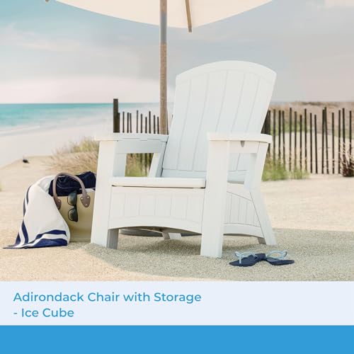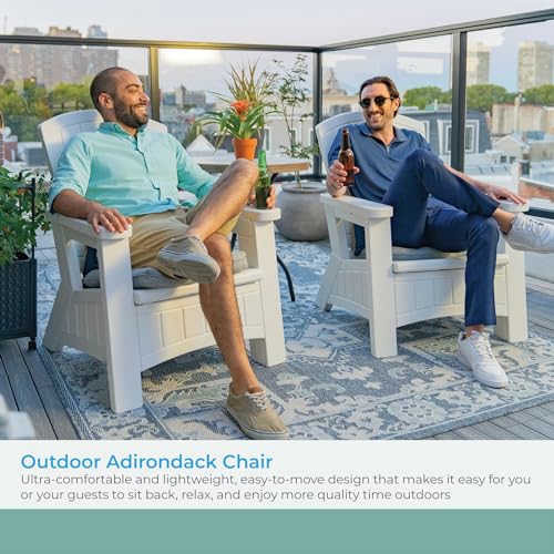 Amplify your out of doors living space with comfort, style, and convenience with the Suncast Adirondack Chair with Storage. This patio chair with an ultra-comfortable and lightweight, easy-to-move design makes it easy for you or your guests to take a seat back, chill out, and enjoy more quality time outdoors. Featuring a spacious 8-gallon storage area beneath the seat, the storage chair can conveniently hold your patio furniture cushions, blankets, and more than a few other out of doors accessories year-round, keeping them safe and easily accessible. The classic yet up to date faux wood grain texture and latest design effortlessly complement other patio furniture and add luxurious style to any out of doors space. Constructed from durable, UV-resistant multi-wall resin, this patio Adirondack chair is easy to clean and handle and withstands years of quality use outdoors. The out of doors chair has a weight capacity of 375 pounds and measures 30″ W x 32.5″ D x 38.5″ H for the easiest fit on any patio, backyard, front porch, balcony, or sunroom.