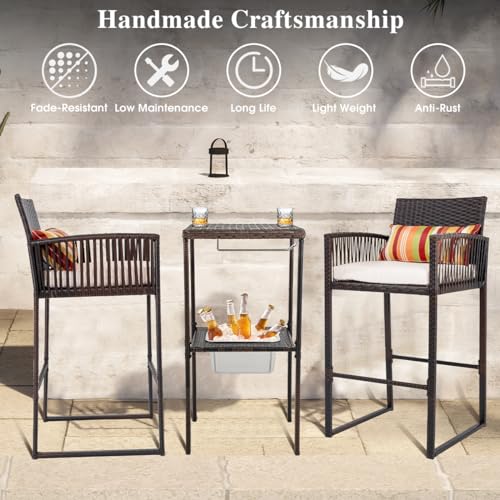 All-in-One Out of doors Wicker Bar Set: Elevate your backyard or patio revel in with this stylish and functional set, featuring 2 wicker rope bar stools, a bar table with an HDPS tabletop, an ice bucket, a glass holder, 2 pillows, and 2 cushions.
