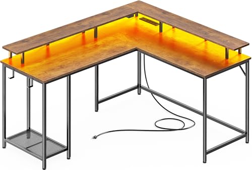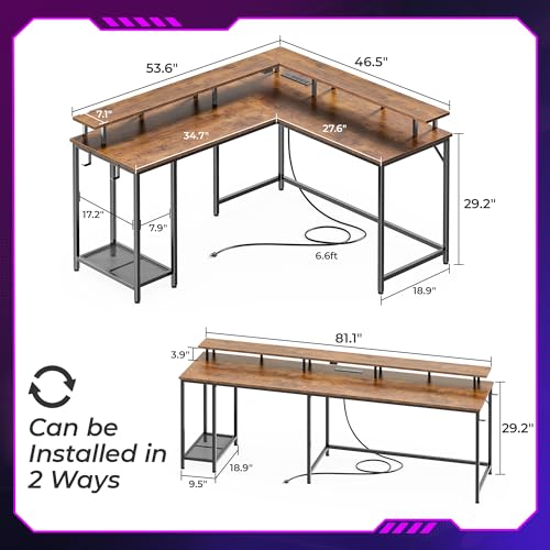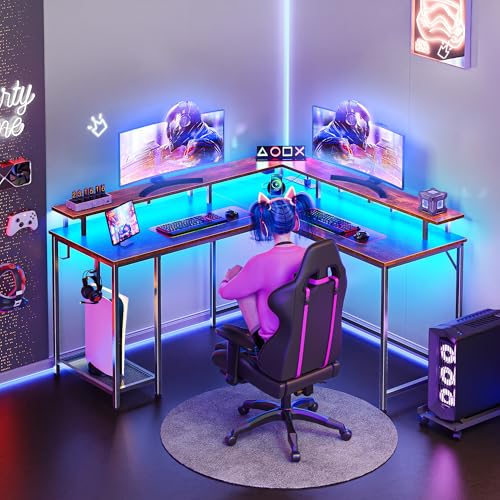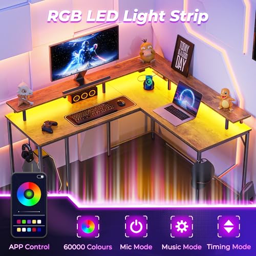 【Gaming Desk with LED Lights】This L shaped desk features built-in LED lighting with 20 static colors, 22 dynamic modes, 10 speed grades and 5 brightness grades to create beautiful ambiance that enhances your room. This gaming desk can also be installed as a long desk in step with your needs, good choice for your bedroom, study and workplace.