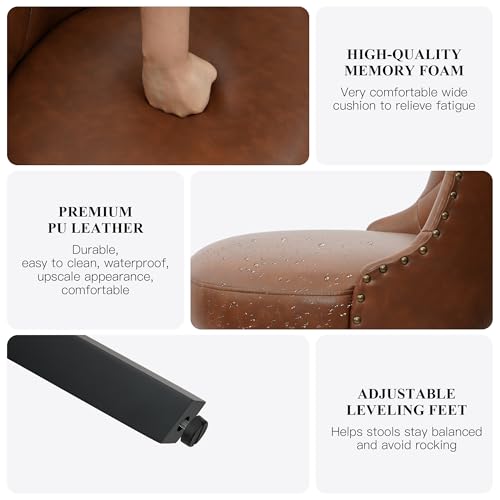 【COMFORTABLE BACK & SEAT】 This bar stools with back are ergonomically designed with soft PU Leather and memory foam padding to make sure no deformation in long term use, cushion size: 19.6W*16.5D, which can bring you comfortable seating experience.