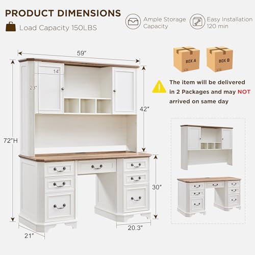 VERSATILE TWO-TIER DESK: This home office desk features a hutch cabinet for added storage space. The spacious 59” wide desktop on the lower level boosts work efficiency.providing room for laptops, books, and other essentials. The front drop-down keyboard drawer saves space while enhancing ergonomic comfort during long hours of work.