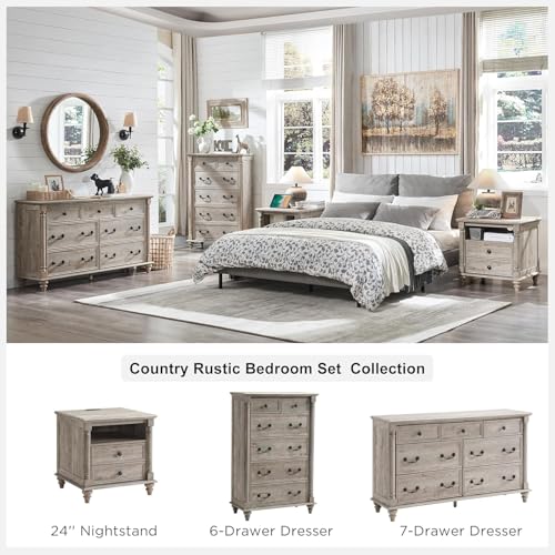 EXQUISITELY CRAFTED: Measuring 54”W* 16” D *31.2” H. With a replicated light rustic wood grain with an authentic touch that stands proud against the distressed finish, this transitional 7-drawer dresser brings a warm presence to your bedroom/living room. Beautified with 4 solid wood feet & and the solid wood column decor which is wonderfully easy at the eyes. Paired with the unique antique-tone pulls which is made for years of satisfaction. IT COMES WITH A WHOLE SET BEDROOM FURNITURE COLLECTION TO PAIR