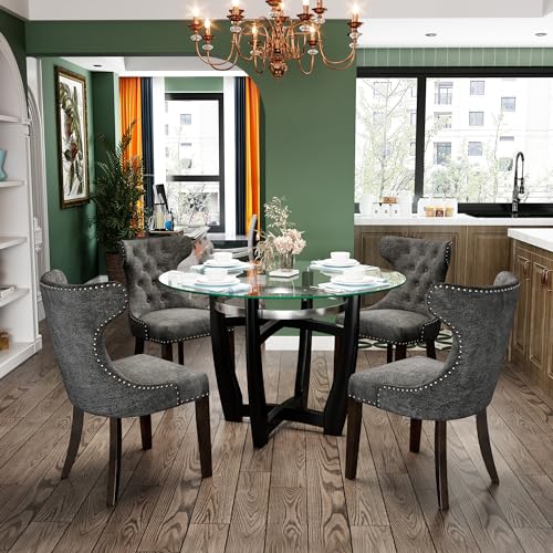 Chic Glass Dining Table Chair Set: Full of modern charm, PADMA HOUSE Dining Table made of solid wood leg base and tempered glasstop, making a stylish remark. The wingback dining chairs built with wood legs and velvert fabric finish plus nailhead trim are sure to add a touch of elegance to your home.