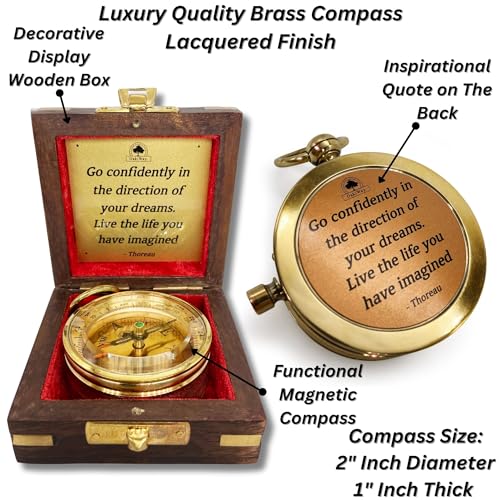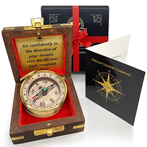 🎁INSPARITIONAL GIFT FOR ANYONE: We all pursue to fulfil our dreams – The Dream Chaser is the best gift to motivate and make sure not disregard our goals. This Luxury compass is made of high-quality polished brass and features the message “Go expectantly in the direction of your dreams! Live the life you’ve imagined.” by Thoreau, it comes in a beautiful decorative wooden box, It’s a unique and personalized gift for anyone.
