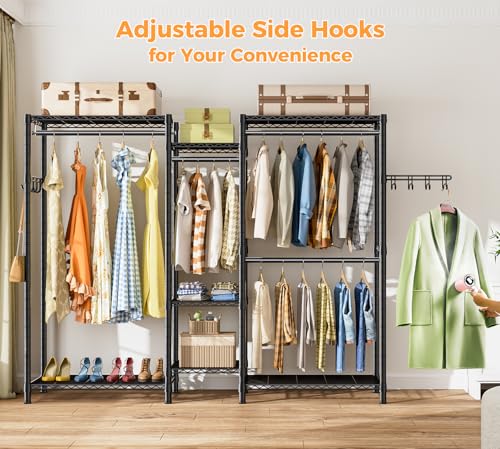【Strong & Durable】This clothing rack is built with high-quality metal poles and robust wire shelves. All metal components are powder-coated to withstand water and rust, making it easy to clean and built to last for years of reliable use.