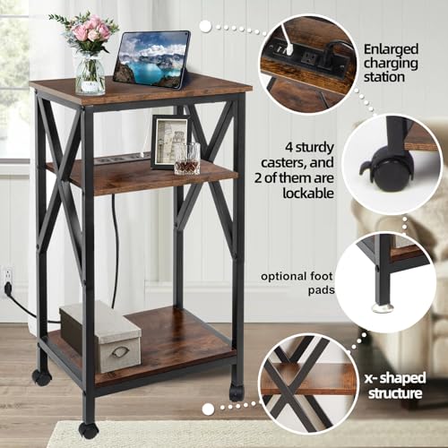 TooCust 3 Tier End Table with Charging Station, 16″ W x 12″ D x 28″ H, Metal and Brown Bedside Table with USB Ports and Outlets, X-Shaped Side Table with Wheels for Living Room, Bedroom, Kitchen
