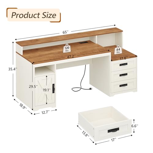 【Spacious & Convenient Workspace】: This computer desk with drawers has a 65-inch wide desktop and built-in power strip. The desktop can accommodate your office necessities, including monitors, laptops, or other supplies. The office desk is equipped with 2 sockets and 2 USB ports, which is convenient for charging tablets, printers, or mobile phones