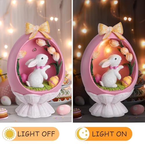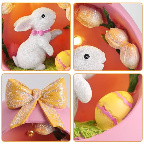 【Lighted Bunny Figurine】– The Easter bunny egg Decoration features an adorable design with a built-in warm light that creates a soft and festive atmosphere. The warm glow from within the egg creates a cozy and inviting ambiance. Whether displayed in your desk or for your bedroom, it effortlessly draws attention as an enchanting centerpiece.(NOTE:If it run out of power, just replace the button battery (1.5V) without charging)