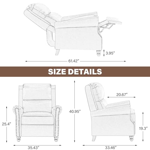 Suitable Dimensions, Application Scenario – Kindly please confirm the size before buying. This recliner chair measures at 35″W X 33″D X 41″H, Seat Dimensions – 22″W x 20.5″D x 19″H. The minimalist and generous appearance can add more vitality to your room and is ideal for waiting room, living room, bedroom, vanity room, dressing room, office, reception.