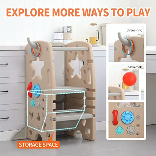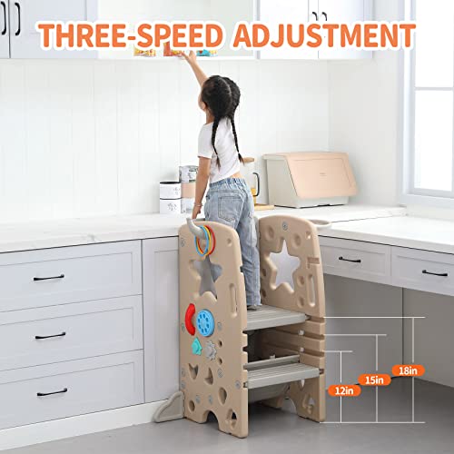 UNICOO Multifunctional Kids Step Stool with Double Safety Rails, Height Adjustable, Toddler Tower for Kitchen Countertop and Bathroom with Big Drawing Board & Games (OMLT-Light Brown)