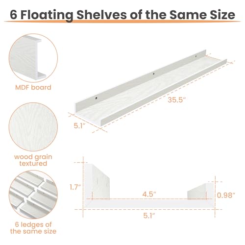 upsimples Floating Shelves for Wall, Wall Shelves for Decor Storage Set of 6, Wall Mounted Wood Shelves for Bedroom, Living Room, Bathroom, Kitchen, 35.5 inch Long Picture Ledge Shelves, White