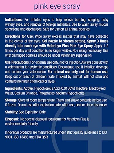 [Made in USA] Vetericyn Plus Pink Eye Spray is a next-generation eye care solution for all animals, designed for use when their eyes are showing signs of pink eye. This pH balanced solution is used for cleaning, irrigating, and flushing eyes, which sets the stage for optimal healing conditions. All Vetericyn Plus product are made with hypochlorous technology, for a protected and effective alternative to antibiotics.