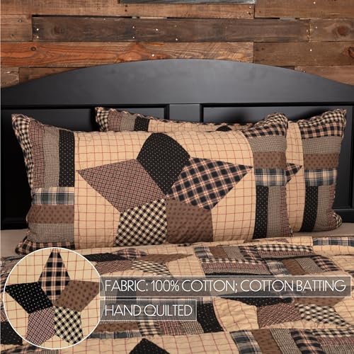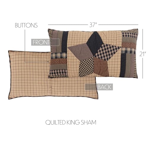 Warm, traditional tones of black, tan and barn red in a wealthy selection of vintage patterns form a rustic, cozy accent on your country style bedding. The Bingham Star King Sham includes one 21×37 sham pillow cover with a mixture of long rectangular blocks forming a left and right border that brings attention to a central star design. This cotton pillow sham reverses to a tan and red windowpane plaid for an alternate look. The decorative pillow case features a button-style closure to carry your fill pillow (not included) in securely. Machine washable and iron secure.