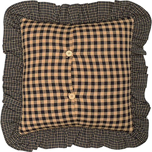 RUFFLED FLANGED EDGING: A singular, wide double ruffle in a tan and black checkered plaid and black windowpane plaid adds a warm, primitive look on your couches or chairs.