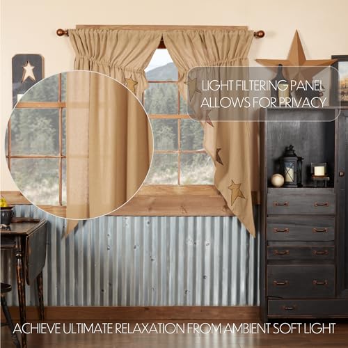Create a timeless, primitive home with soft, warm and inviting natural tan cotton burlap. The Stratton Burlap Short Panel Set of 2 63x36x18 fits classic country and up to date primitive looks with loosely woven cotton burlap accented by folk art style applique stars in bright shades of red, orange and yellow plaid. The unlined curtains create the easiest balance of light and privacy. The gracefully angled drapes perfectly frame windows providing somewhat of polish and charm. The panels come with built in drawstrings to adjust every panel to meet your style needs, at the side of a curtain rod pocket for simple hanging. Machine washable and iron secure for simple care.