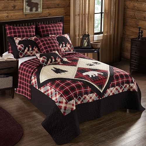 • Virah Bella 3 Piece Queen Lodge Quilt Bedding Set Diamond Bear Lodge Rustic Cabin Country Reversible Camping Comforter Set with Decorative Pillow Shams BurgundyBlack