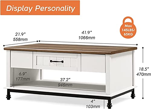 WAMPAT White Modern Farmhouse Coffee Table with Black Matel Legs, Wood Rectangle Center Table with 1 Storage Drawer for Living Room, 42″