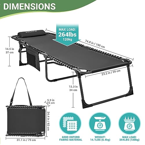 Versatile and Foldable Design: Perfect for indoor or Out of doors use, this folding lounge chair can be utilized on the beach, patio, pool, lawn, garden, deck, workplace nap, bedroom, or as a temporary guest bed. It includes a 5-position locking system and ergonomic design for customizable seating positions.