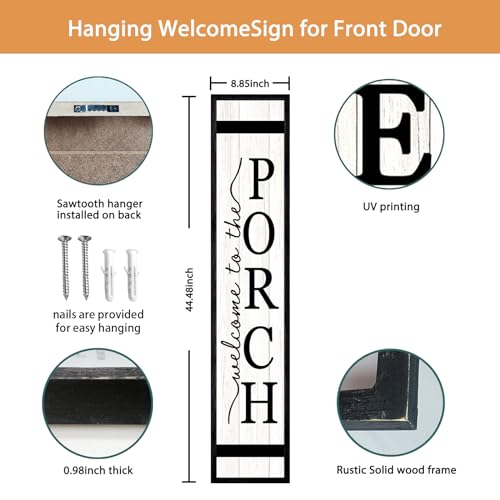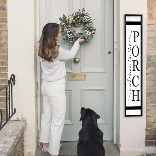 Welcome To The Porch Sign For Front Porch Standing 45″X9″ Wood Frame Large Rustic Farmhouse Outdoor Tall Board Welcome Sign Modern Home Outside Front Door Vertical Wall Decor (Black)