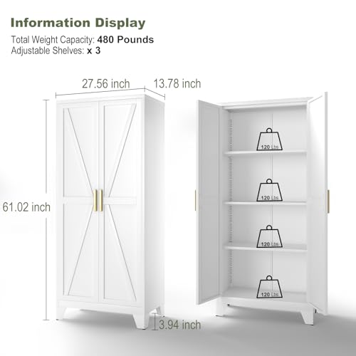 Storage Space: Once assembled, this storage cabinet boasts dimensions of 61.02 inches x 27.56 inches x 13.78 inches. with 4 tiers of space and 3 fully adjustable shelves, creating a versatile storage solution that can easily accommodate any item you wish to have to store. It’s the perfect fit for all of your storage needs.