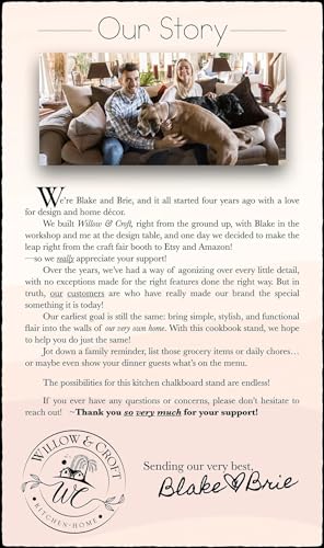 From Craft Fairs To High-End Housewares, meet The Handcrafted Willow & Croft Cook Book Holder! DIMENSIONS: 14.6Inches tall and 8.9Inches wide wooden stand with and 8.9×5 countertop footprint. FEATURES: (1) Fits big cookbooks up to 14 inches tall and 1.7 inches thick. (2) Fully-adjustable reading angle with ergonomics in mind, and it may be neatly folded and hung away with the rustic twine loop! (3) Silicone bumpers for high surface grip without scuffing or scratching countertops. (4) Space-saving design to reduce countertop clutter. (5) Carbon steel crossbar allowing unobscured recipe reading. (6) Gift-in a position, with tissue paper and a name-brand sticker seal, for a charming unboxing experience that your circle of relatives will love! HANDMADE CRAFTSMANSHIP: Made from the finest European Scots Pine (0.3 in. thick), with 2 coats of paint then sanded by hand for a rustic farmhouse look. CARE: May also be wiped clean, do not submerge. USES: Durable recipe holder, tablet or iPhone holder, chopping board holder, rustic kitchen decor, and household notes display. Each and every bookstand ships with a 3-Year, All-Inclusive Warranty guaranteed by WC Brands LLC. Order yours NOW from Willow & Croft