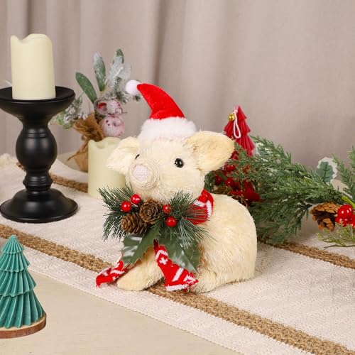 Adorable and Charming Design: This Christmas pig table decoration features a whimsical design, with its entire body adorned in pure white, evoking a warm and serene winter vibe. It’s topped with a classic red and white Santa hat and a vibrant red scarf tied around its neck.