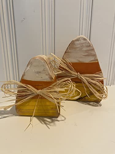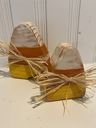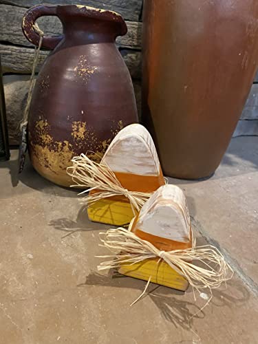 This set of 2 Wood candy corn will add a cute rustic Fall decor touch to any home. And is great for decorating throughout the Halloween, Fall, and Thanksgiving Holidays. It’s handmade and every one can be unique as every piece of wood is different with its own flaws. We Hand paint every candy corn so every candy corn would possibly look somewhat different as well. (Paint Color would possibly somewhat vary from picture.) They do have a rustic worn out look with a piece of raffia tied and hot glued on every one.