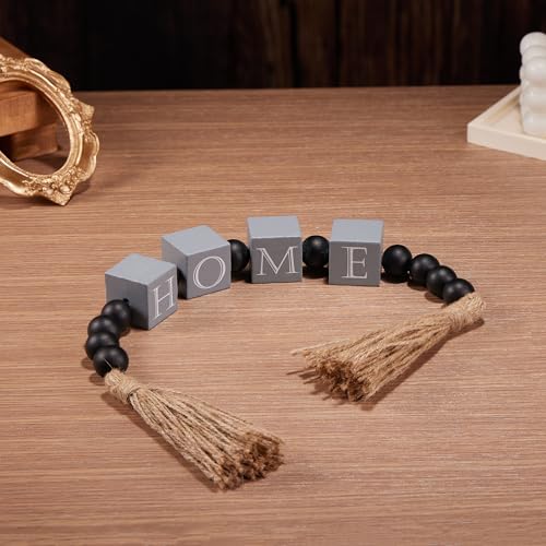 • Wood Home Sign Block Bead Garland with Jute Tassel for Home Decor Modern Farmhouse Decoration for Tabletop Mantel Shelf Tiered Tray Decor Grey