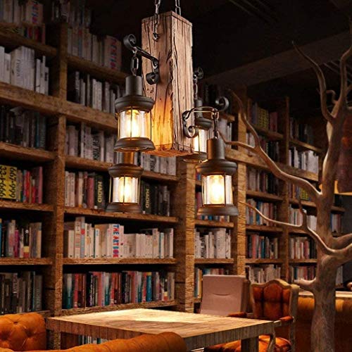 Wood Retro Pendant Lighting Industrial Vintage Chandelier Black Metal Bedroom Restaurant Suspension Lamp Cage Frame with Glass Shade House Loft Bar Coffee Decoration Ceiling Lights Fitting, E27