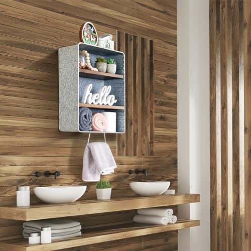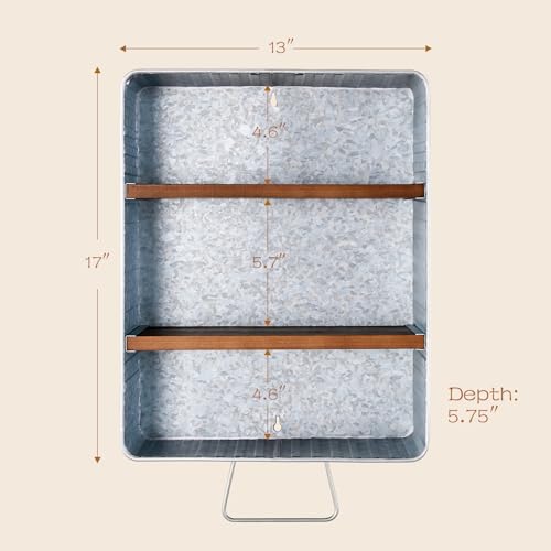 Upgrade Storage Space & Place Taller Products. This bathroom rustic galvanized shelf is the perfect rustic farmhouse decor accessory. Easy to pull out and remove the upper and lower wooden shelves. The adjustable farmhouse bathroom shelf spacing makes it easier so that you can place big bottles or jars. The galvanized tub is 17 inches tall, 13 inches wide and 5.75 inches deep. The new rectangle shape design will offer much more storage space than the traditional oval-shaped galvanized washtub shelf.