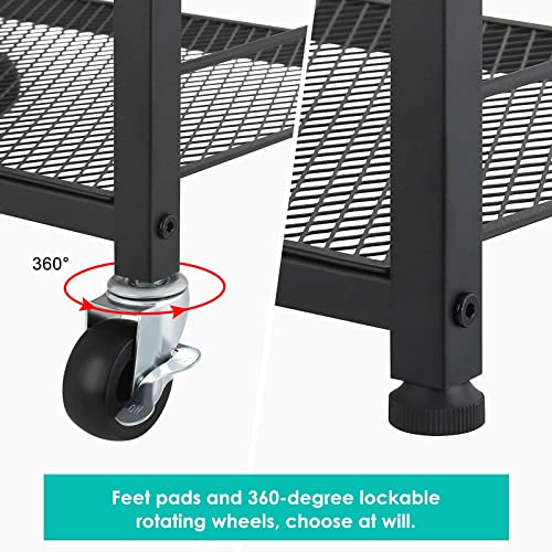 Ventilated Iron Mesh:The cart on wheels for kitchen has 3 layers of iron mesh shelves. The mesh size is moderate to facilitate ventilation. The plates or bowls will not accumulate water on them. The iron mesh is high-quality metal and can hold up to 35 pounds per layer. The wooden shelf at the top can be utilized as an extension for your desktop