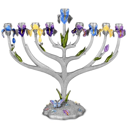 Exquisite Menorah – The botanical Chanukiah iris flowers are hand-painted with intricate details in vibrant colors, making it a stunning uniqe Hanukkiah.