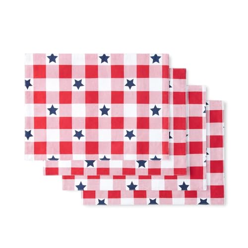 MARTHA STEWART Americana Star Gingham Plaid Indoor Placemat 4-Pack Set, Reversible, Patriotic USA America Decor, Red/White/Blue, 14"x72"